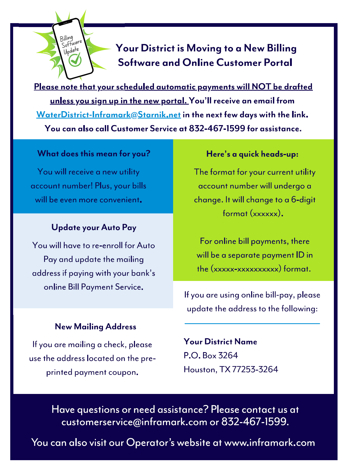 - If you currently pay thru Inframark’s online portal, manually or via Auto-Pay, you will need to follow the link in the email sent to you from WaterDistrict-Inframark@Starnik.net to set up a new billing profile. If you do not see the email, please check your spam/junk folders.